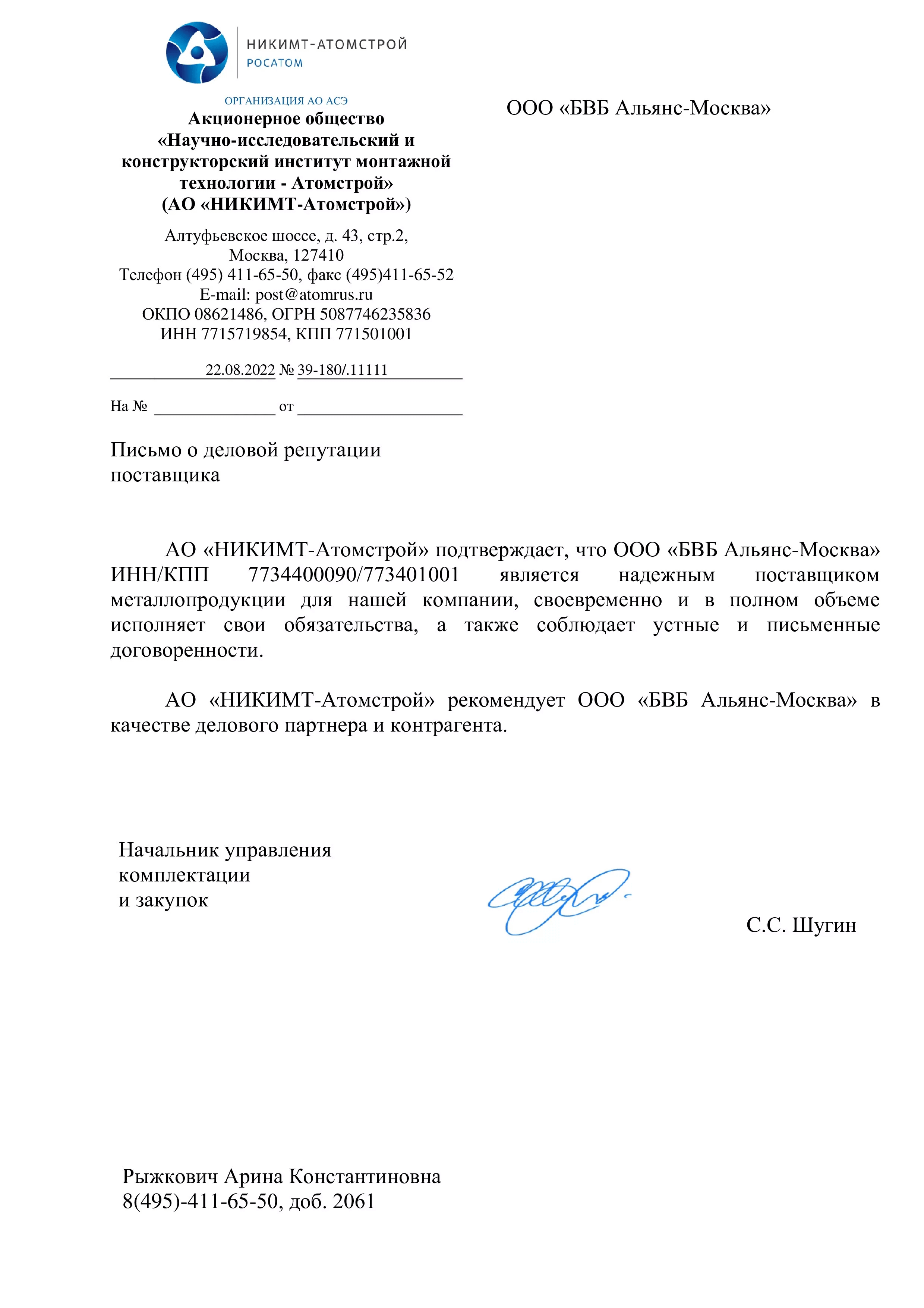 Благодарственное письмо генеральному директору ООО «БВБ–Альянс» от АО «НИКИМТ-Атомстрой» за поставку металлопродукции.